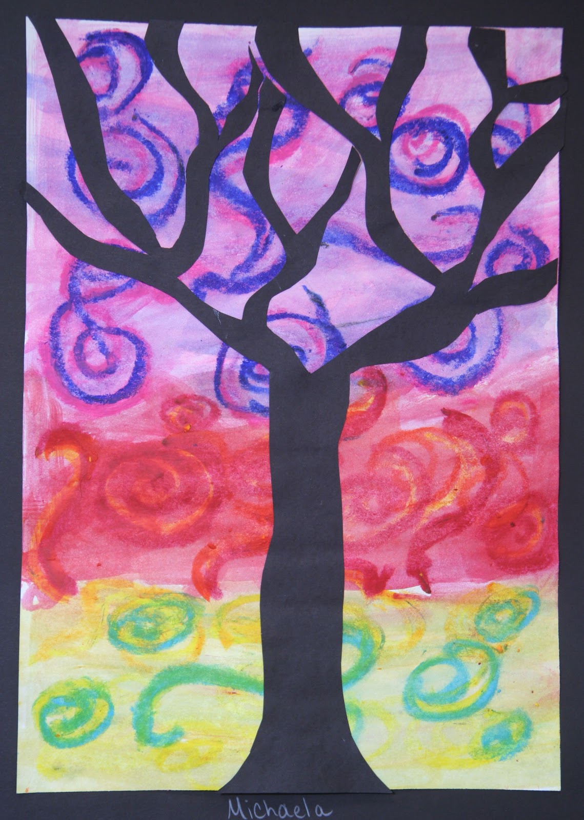 My amazing 6th graders created these beautiful paper tree silhouettes.  I showed them how to use the Portfolio water soluble oil pastels by drawing on their paper using lines that express rhythm and movement and spreading the color around their paper with a wet paintbrush.  We talked about the color wheel and which colors will mix well together and which ones will look like 'mud' when mixed.  The students chose what time of day they wanted to depict and which colors would best represent that particular time of day.  While their paper was drying, we started to draw the trees.  This is a difficult task to draw branches using lines that overlap, show thickness/thinness, and are connected together.  Here are some of the finished projects: